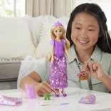 - Jednoducho obliekateľná bábika Rapunzel má dva korzety s možnosťou jednoduchého pripnutia, dve sukne s tlačenými ikonami z jej príbehu a deväť tematických doplnkov.