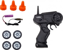 Súčasťou sú dva typy kolies – s behúňom pre lepšiu priľnavosť a hladké kolesá pre efektný drift. Vytvorte si vlastnú trať pomocou dodaných kužeľov a trénujte prejazdy zákrut aj slalom. Auto je napájané akumulátorom 3,7 V (v balení), ovládač vyžaduje 2× AA (nie sú súčasťou).