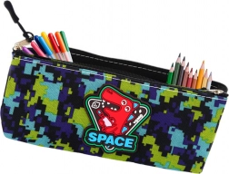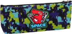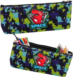 Táto kozmetická taška vás zaujme pestrým pixelovým vzorom vo farbách modrej, zelenej a čiernej s grafickým motívom vesmírneho dinosaura.