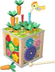 - Šesť rôznych aktivít: Hračka ponúka vyťahovanie mrkvy, skladanie tvarov, hudbu na xylofón, otočné ozubené kolieska a hodiny na učenie sa času.