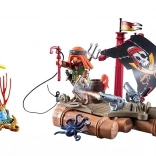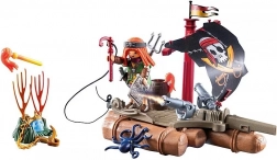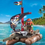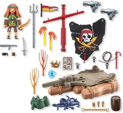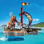 Vydajte sa na nebojácne putovanie za pokladmi s pirátskou plťou z rady PLAYMOBIL! Plť má otočnú balistu a svieti v tme vďaka hlave v tvare lebky, čo je perfektné pre epické námorné súboje. Odvážny pirát bráni svoj lup, ochraňujúc krištáľovú lebku a korunu pomocou dela, zachraňujúc sa pred útočnou piraniou.