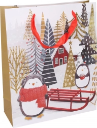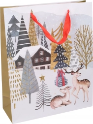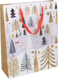 Štýlová vianočná darčeková taška v strednej veľkosti na jednoduché a elegantné zabalenie darčekov. Praktický formát, pevné prevedenie a štyri rôzne sviatočné motívy dodajú každému darčeku výnimočný vzhľad bez zbytočného balenia.
