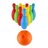V balení nájdete 10 farebných kolkov a oranžovú bowlingovú guľu s otvormi na prsty. Stačí ich rozostaviť a začať hrať.