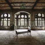 - Detailné zobrazenie opustenej miestnosti s veľkými oblúkovými oknami a graffiti na stenách.