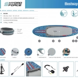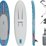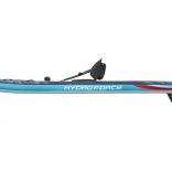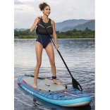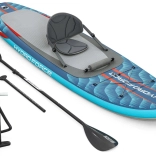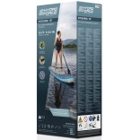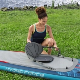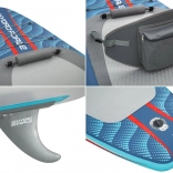 V niekoľkých krokoch z neho vytvoríte pohodlný sit-on-top kajak – stačí pripnúť sedadlo s operadlom a podnožník. Integrované úchyty, elastické laná vpredu aj vzadu a zadné D-krúžky umožňujú pripevniť osobné veci či chladiacu tašku. Tri odnímateľné plutvy zlepšujú smerovú stabilitu, rýchloupínací bezpečnostný leash možno nosiť na členku aj v páse. Dvojčinná ručná pumpa zabezpečí rýchle nafúknutie a po jazde dosku ľahko vyfúknete a uložíte do deluxe batohu.