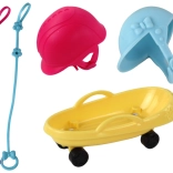 Roztomilý pes husky so žltými sánkami/vozíkom a prilby pre bezpečnú hru podporujú starostlivosť, kreativitu a role-play.