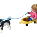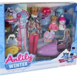 - Hlavná bábika ANLILY, malá bábika, pes husky na vodítku, žlté sánky/vozík, fialový snežný skúter, korčule, 2 prilby, snehuliak, drobné doplnky