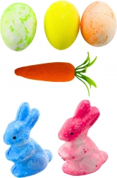 Tento set obsahuje farebné vajíčka, zajace a mrkvu, čo mu dodáva klasický veľkonočný vzhľad.
