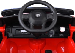 Auto sa štartuje tlačidlom – ozve sa zvuk štartu a chodu motora a rozsvietia sa predné svetlá. Multimediálny volant má klaksón a ovládanie hudby, panel ponúka USB/Mp3 vstup, predinštalované pesničky, indikátor nabitia a tlačidlo pre majáky a sirénu. Prepínač High/Low mení rýchlosť, voliť smeru radí vpred/vzad a bezpečnostný zámok prepínača bráni deťom samostatne meniť režim.