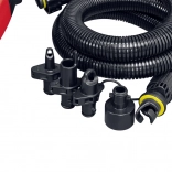 Súčasťou je flexibilná hadica a štyri adaptéry pre širokú škálu ventilov – od matracov cez člny až po paddleboardy.
