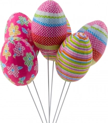 Naše veľkonočné dekoratívne vajíčka na tyčkách sú perfektnou voľbou pre vytvorenie unikátnej, sviatočnej výzdoby. Sada obsahuje 2 vajíčka s bodkami, 2 s prúžkami a 2 s kvetinovým motívom. Vajíčka sú vyrobené z ľahkého a odolného styroporu a vďaka pružným drôtikom ich môžete ľahko umiestniť do rôznych dekorácií.