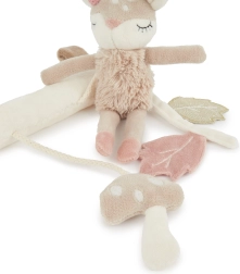 Roztomilá závesná hračka s motívom srnčeka Elly poteší bábätká od narodenia a podporí ich rozvoj. Vďaka praktickým suchým zipsom ju ľahko pripevníte na kočík, autosedačku či hrazdičku. Hračka ponúka zmyslovú stimuláciu vďaka rôznym textúram a zvukom: listy šuštia, srnček hrká a hubka príjemne vibruje/vrní. Je vyrobená z mäkkého a hebkého polyesteru, šetrného k citlivej detskej pokožke.