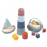 Zažite zábavu s hernou sadou 3 v 1 Little Smoby, ktorá obsahuje vežu, tvary na vkladanie a loďku s plachtou, ideálnu na hranie doma aj vo vani.