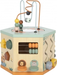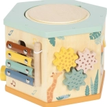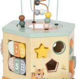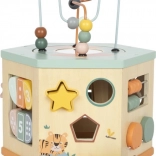 Táto robustná drevená aktívna kocka v jemných prírodných a pastelových odtieňoch so zvieratkami zo safari prináša bohatý výber činností pre zábavu aj rozvoj zručností. Deti môžu objavovať korálkový labyrint, posúvať prvky v dráhach, triediť tvary, hrať na xylofón a trénovať logiku aj sústredenie.