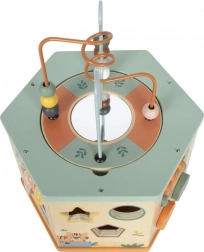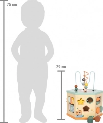 • Bohatá výbava: korálkový labyrint, posuvné dráhy, zrkadielko, vkladacie tvary, malé počítadlo, xylofón, ozubené kolieska a ďalšie.