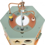 - Bohatá výbava: korálkový labyrint, posuvné dráhy, zrkadielko, vkladacie tvary, malé počítadlo, xylofón, ozubené kolieska a ďalšie.