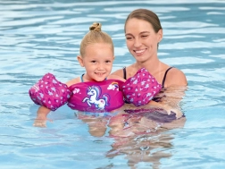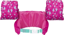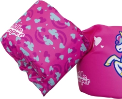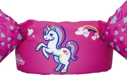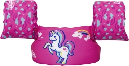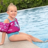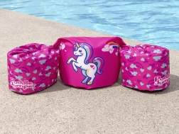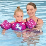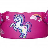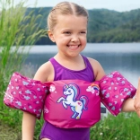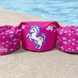 Ružový motív s jednorožcom, srdiečkami a dúhou motivuje deti k hre vo vode a zvyšuje ich sebavedomie pri učení plávania.