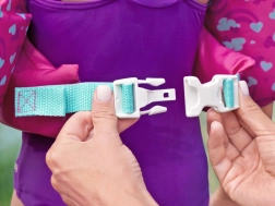 Pevná plastová pracka s nastaviteľným popruhom sa zapína vzadu, takže drží iste a deti si ju samy nerozopnú.