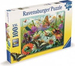 Puzzle obsahuje detailné ilustrácie rôznych druhov hmyzu obklopených pestrými kvetmi, čo vytvára nádherný pohľad na biodiverzitu.