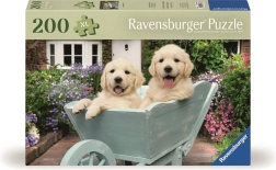 Ravensburger puzzle prináša pohľad na dve roztomilé šteniatka zlatých retrívrov, ktorí sedia v svetlom drevenom kolese. Toto puzzle je skvelým doplnením každej domácej zbierky a slúži ako úchvatný dekoratívny prvok po zložení.