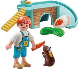 Objavte svet domácich miláčikov s hernou sadou PLAYMOBIL, v ktorej sa chlapec s láskou stará o dve roztomilé morčatá. Farebný domček pre hlodavce s úkrytmi, schodmi a šmykľavkou ponúka množstvo možností, ako sa hrať a vymýšľať nové príbehy. Súčasťou sú aj doplnky na kŕmenie, vrátane mrkvy, zväzku trávy a napájačky.