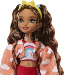 Dlhé vlnité hnedé vlasy s čelenkou a mašľou, crop top s dúhou, obláčikový svetrík a červená sukňa – všetko ľahko kombinovateľné a odnímateľné.