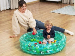 Súčasťou balenia je 50 farebných loptičiek, takže bazénik ľahko premeníte na suché ihrisko pre zábavu počas celého roka. Bezpečnostné ventily pomáhajú udržať vzduch vo vnútri a dvojitý prstenec poskytuje stabilnú oporu pri sedení aj hraní.