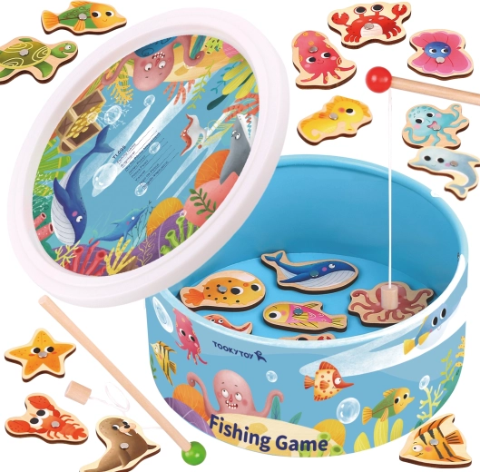 Chyťte čo najviac farebných rybičiek pomocou drevených prútov s magnetom a užite si spoločnú rodinnú zábavu. Detská hra TOOKY TOY je ideálna pre jedno aj viac detí, podporuje sústredenie, presnosť a zdravú súťaživosť. Praktické balenie s uchom sa ľahko prenáša.