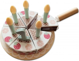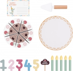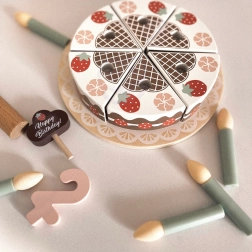 Drevená narodeninová torta v lákavom „jahodovo-čokoládovom“ dizajne je ideálna do detských kuchyniek a na oslavy. Šesť krájacích dielikov sa spája pomocou pevného suchého zipsu, takže deti môžu tortu ľahko porciovať a znova skladať. Súčasťou sú sviečky, čísla 1–5, kartička s prianím a lopatka na servírovanie.