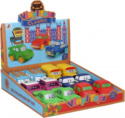 Ľahučké autíčko z mäkkého plastu s dĺžkou 9 cm a voľne bežiacimi kolesami. Na výber je 6 variantov: Chrobák, Trabant, športiak, Mini, autobus, dodávka. K dispozícii aj display box 12 ks.