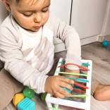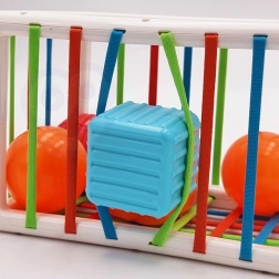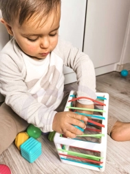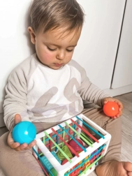 Kocku je možné použiť aj pre vyučovanie farieb a tvarov v neskoršom veku. Elastické farebné gumy kocky sú pre dieťa príjemné a uľahčujú vkladanie predmetov. Tento nepostrádateľný produkt je ideálny pre deti od 12 mesiacov veku, pomáha rozvíjať jemnú motoriku.