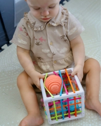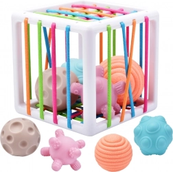 Táto senzorická kocka s pružnými gumičkami je ideálnou pomôckou pre deti, ktoré rady objavujú svet dotykom. Mäkké tvary s rôznymi povrchmi deti ľahko uchopia, stlačia a pretlačia cez elastické pásy. Hra prirodzene rozvíja jemnú motoriku, hmat a koordináciu, zároveň posilňuje trpezlivosť a logické myslenie.