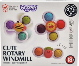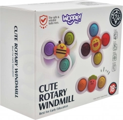Sada WOOPIE obsahuje tri roztomilé spinnery v tvare slniečka, včielky a mrkvičky. Vďaka odolným ložiskám sa hračky plynulo a dlho točia, zatiaľ čo farebné gumové prvky lákajú deti k stláčaniu a objavovaniu rôznych textúr. Prísavky umožnia hračky jednoducho pripevniť na hladké povrchy – okno, obklad, vaňu alebo stôl.