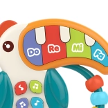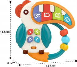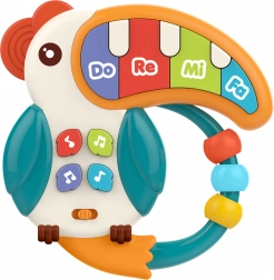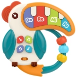 Pelikán od Woopie je ideálna prvá hudobná hračka pre najmenších. Vďaka farebným klávesom s tónmi „Do, Re, Mi, Fa“ deti ľahko objavujú svet hudby, zatiaľ čo posúvaním korálikov a stláčaním tlačidiel trénujú jemnú motoriku aj oko–ruka koordináciu. Mäkký hrebeň a oblúk s krúžkami zároveň fungujú ako hryzadlo na úľavu pri prerezávaní zúbkov.