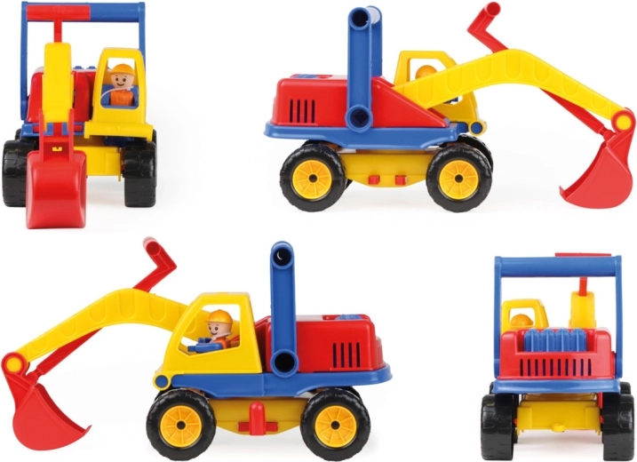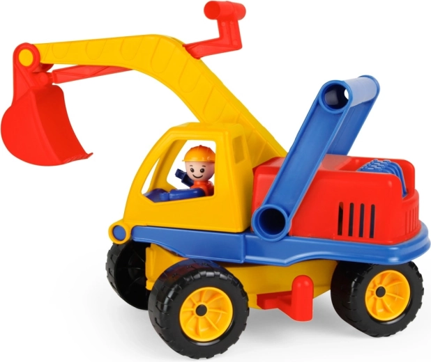 Farebný detský bager s dĺžkou 35 cm s otočnou hornou časťou, funkčným ramenom a figúrkou vodiča v kabíne. Disponuje 2 nápravami, blokáciou otáčania a praktickou rukoväťou za kabínou pre jednoduché ovládanie – ideálne na pieskovisko aj na domáce hranie.