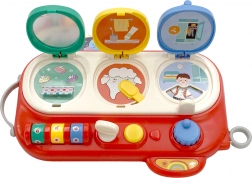 Táto chytrá vzdelávacia hračka má tri okienka, z ktorých každé sa otvára iným spôsobom – na kombináciu symbolov, kľúčikom alebo tlačidlom a otočným ovládačom. Vo vnútri deti nájdu rôzne prekvapenia: vytahovacie „šatôčky“, obrázok zúbka s pohyblivou kefkou aj postavičku s otočným výberom oblečkov. Každé gesto má jasný výsledok, čo posilňuje pochopenie príčiny a následku.