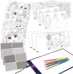 - Tablet, USB kábel, 5x obojstranná pastelka, 1x čierny fix, inšpiratívne archy
