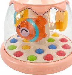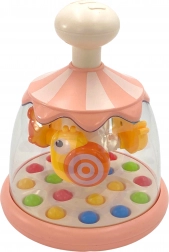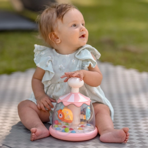 Objavte kúzlo jednoduchej interaktívnej hry: stačí zatlačiť na veľké horné tlačidlo a priehľadná kupola sa premení na mini kolotoč so zvieratkami a šantiacimi guľôčkami. Deti si užijú farebné efekty, pohyb a jemné zvuky, ktoré prirodzene rozvíjajú ich zmysly.