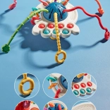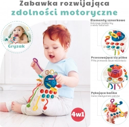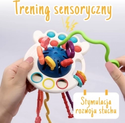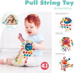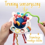Objavte multifunkčnú senzorickú hračku a hryzadlo inšpirované metódou Montessori, ktoré podporuje rozvoj zmyslov, jemnej motoriky a prináša úľavu pri prerezávaní zúbkov. Farebné ťahacie šnúrky s rôznymi textúrami, točiace prvky a pop bublinky lákajú k uchopeniu, ťahaniu a skúmaniu, zatiaľ čo bezpečné materiály a jednoduchá údržba potešia rodičov.