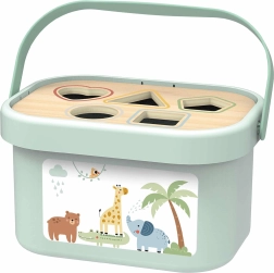 Veko s výrezmi na tvary učí deti triediť a rozpoznávať tvary a farby. Diely možno po hraní uložiť dovnútra a box pohodlne preniesť za praktické držadlo.