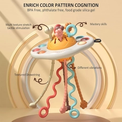 Objavte multifunkčnú senzorickú hračku v tvare UFO, ktorá kombinuje hryzátko, hrkálku a interaktívne „ťahacie“ šnúrky. Podporuje rozvoj motoriky a koordinácie, stimuluje zrak, sluch aj hmat a zároveň uľavuje pri prerezávaní zúbkov. Bezpečné materiály bez BPA a jednoduchá údržba z nej robia ideálnu voľbu pre bábätká od 6 mesiacov.