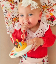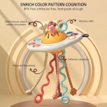 Táto detská montessori hračka WOOPIE BABY v tvare UFO ponúka pestré senzorické podnety vďaka šiestim šnúrkam s rôznymi textúrami a farbami, trom mäkkým tlačidlám a jednému pevnému posuvnému tlačidlu. Ťahanie za šnúrky vyvoláva rôzne zvuky a jemné vibrácie, ktoré podporujú zvedavosť a sústredenie. Mäkké okraje a štruktúrované plochy poskytujú úľavu citlivým ďasnám pri zúbkovaní.