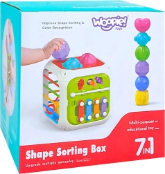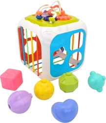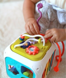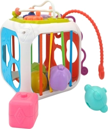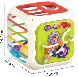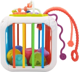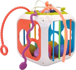 Kocka je vyrobená z kvalitného ABS plastu a silikónu, je odolná a bezpečná pre detské rúčky. Súčasťou sú aj triediace kocky so skrytými rolničkami, ktoré motivujú k experimentovaniu so zvukom, tvarmi a farbami. Odnímateľná horná časť rozširuje možnosti hry – dieťa ju môže používať samostatne na podložke alebo v kočíku.