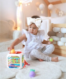 Aktívna kocka WOOPIE je premyslená vzdelávacia hračka, ktorá v jednom kompaktnom tvare ponúka množstvo činností na každodenné objavovanie. Od odnímateľného horného panelu s mini xylofónom, cez ozubené kolieska a korálkový labyrint až po textúrované šnúrky – každá strana prináša iný podnet pre rozvoj koordinácie oko–ruka, sústredenia a kreativity.