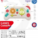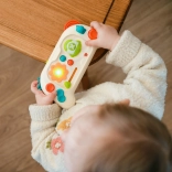 Uprostred ovládača nájdete tlačidlá s efektom pop-it, ktoré poskytujú príjemnú hmatovú spätnú väzbu. Ďalšie ovládacie prvky sa otáčajú alebo klapkajú, posuvný zvonček ide ľahko posunúť doľava aj doprava a hudobné tlačidlá spúšťajú melódie a zvuky. Ovládač je napájaný na batérie, takže je pripravený na hranie kdekoľvek.