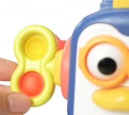 Bucľatý tučniak obsahuje pohyblivé prvky - po stlačení nosa tučniaka hračka zavrnčí a oči sa začnú pohybovať.
