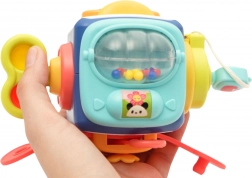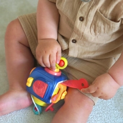 Kocka ponúka rôzne textúry, vzory a farebné prvky, ktoré poskytujú stimulačné zmyslové zážitky a pomáhajú rozvíjať zrak, sluch a motoriku dieťaťa. Interaktívne prvky ako vyskakujúci psík alebo zvončeky prinášajú zvukovú stimuláciu. Hračka zábavne a komplexne podporuje vývoj dieťaťa, čo ju robí vynikajúcou voľbou.