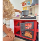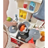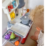 Vďaka robustnému plastovému prevedeniu je kuchynka odolná a bezpečná na každodenné hranie. Bohatá sada doplnkov zahŕňa potraviny, náčinie, hrnce a panvice, aby si deti mohli vyskúšať všetky kroky prípravy jedla – od umývania surovín až po servírovanie.