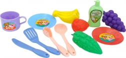 Súčasťou je bohaté príslušenstvo: riad, príbory, fľaštička na „jar“, ovocie a zelenina. Hra podporuje zmyslové vnímanie, koordináciu oko–ruka aj kreatívnu hru. Sada je vyrobená z odolného plastu s hladkými hranami na bezpečné používanie.