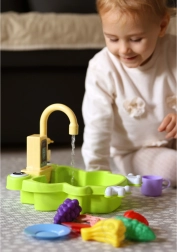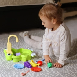 Po naplnení drezu a zapnutí kohútika začne voda cirkulovať – deti môžu „umývať“ ovocie a riad ako dospelí.